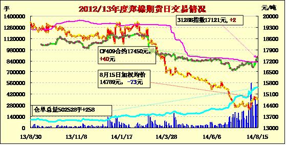 8月15日,鄭棉CF1501合約低開(kāi),盤(pán)中區(qū)間震蕩減倉(cāng),日線(xiàn)形成低開(kāi)陰線(xiàn)星,日內(nèi)成交量萎縮,持倉(cāng)量減少?;久媲闆r:近期隨著前段時(shí)間紡織企業(yè)積極補(bǔ)庫(kù),庫(kù)存比較充裕,市場(chǎng)成交情況轉(zhuǎn)淡。當(dāng)前,新棉長(zhǎng)勢(shì)較好,各地都在后期的關(guān)鍵時(shí)期控制好棉花的質(zhì)量。地方上各棉花企業(yè)積極檢修設(shè)備,為新棉上市收購(gòu)做準(zhǔn)備。