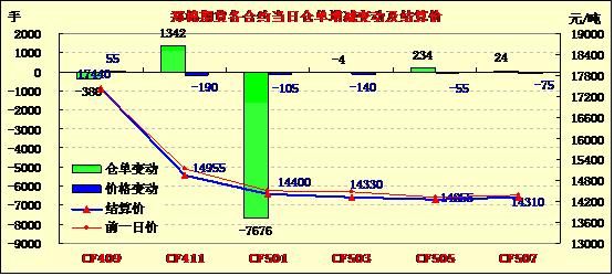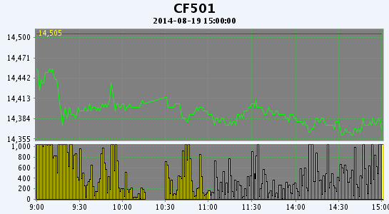 8月19日,鄭棉CF1501合約小幅低開,早盤反彈后在平倉盤的打壓下走低,此后窄幅盤整,尾盤在多頭集中平倉的壓制下收弱,日線形成低開小陰線,日內(nèi)成交量萎縮,持倉量繼續(xù)減少。