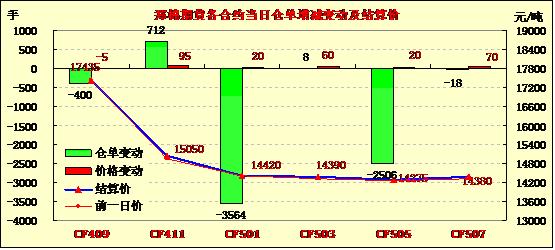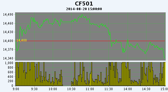 8月20日,鄭棉CF1501合約小幅高開,早盤在多頭買盤推動(dòng)下沖高,盤中高位震蕩換后,午后在平倉盤打壓下收低,日線形成1/2上影線的陰線,日內(nèi)成交量放大,持倉量繼續(xù)減少?;久媲闆r:當(dāng)前大部分紡織企業(yè)需求低迷,行情差,訂單稀少,價(jià)格急速下滑,一些小紡企停工歇業(yè),勉強(qiáng)維持生產(chǎn)的紡企基本隨用隨買。當(dāng)前部分棉區(qū)新棉少量吐絮,湖北新洲、漢川等地新棉少量收購。大部分棉區(qū)新棉采摘基本在9月份左右。當(dāng)前絕大多數(shù)棉區(qū)降雨適中,有利于新棉坐桃,后期天氣情況較好,棉農(nóng)護(hù)理得當(dāng),新棉豐收前景較好。