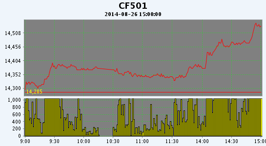 8月26日,鄭棉CF1501合約平開,盤中在多頭買盤推動(dòng)下回升,午后多頭買盤再涌,推動(dòng)期價(jià)收于日高點(diǎn)一線,日線形成陽(yáng)線,日內(nèi)成交量放大,持倉(cāng)量增加?;久媲闆r:當(dāng)前內(nèi)地一些棉區(qū)棉農(nóng)零星采摘棉花,籽棉質(zhì)量相對(duì)較好,棉農(nóng)期望的價(jià)格比較高,由于當(dāng)前籽棉并沒有形成量,因此當(dāng)前收購(gòu)的企業(yè)并不多。