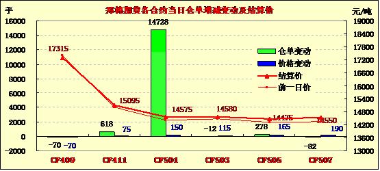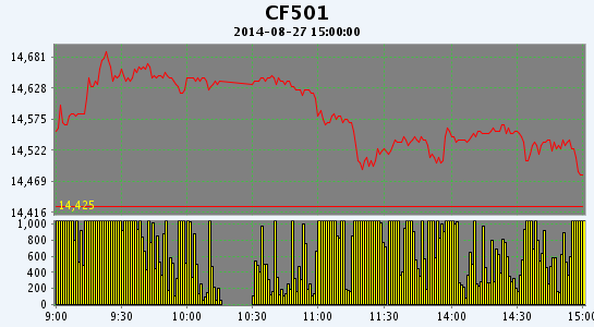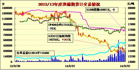 8月27日,鄭棉CF1501合約小幅低開,早盤沖高后于高位增量換后,午間在空頭賣盤壓制下走低,午后重心下移,終盤收于日低,日線形成長上影線的陰線,日內(nèi)成交量放大,持倉量增加?;久媲闆r:當(dāng)前多數(shù)棉區(qū)部分棉花伏前桃已吐絮,棉農(nóng)著手采摘,由于采摘量少,新棉收購企業(yè)并不多。當(dāng)前工作棉農(nóng)采摘后攤曬的新棉質(zhì)量好。大部分新花采摘后棉農(nóng)都不愿意售賣,棉花收購量離開機最低標(biāo)準(zhǔn)相差甚遠,因此不少大型棉花企業(yè)并沒有開秤收購。而由于棉農(nóng)對于新棉價格期望較高,都處于惜售和觀望狀態(tài)。而不少棉花企業(yè)當(dāng)前發(fā)行資金并沒有到位,因此觀望情緒也比較濃厚。