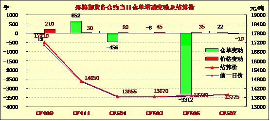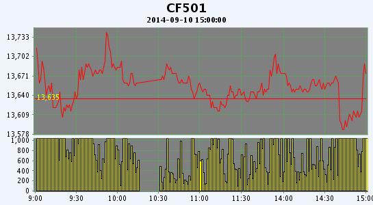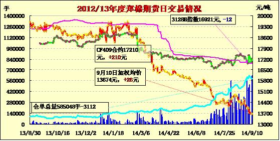 9月10日,鄭棉CF1501合約高開,早盤調(diào)整后沖高,隨后在逢高平倉盤壓制下回落,盤中窄幅震蕩,尾盤探低后在空頭回補(bǔ)買盤推動(dòng)下回升,日線形成陰線星,日內(nèi)成交量萎縮,持倉量減少?;久媲闆r:據(jù)了解,截止9月9日北疆石河子、奎屯、昌吉等地有少量伏前花采摘上市,由于衣分普遍僅35-37%,籽棉水份一般15%-20%,再加上2014年新疆“直補(bǔ)”政策遲遲沒有出臺(tái),已開秤收購或計(jì)劃9月15日前開秤的軋花廠寥寥可數(shù),軋花廠前期統(tǒng)花報(bào)價(jià)6.20-6.30元/公斤(40衣分),最高收購價(jià)6.50元/公斤的價(jià)格已出現(xiàn),而農(nóng)民的最低預(yù)期是7元/公斤,籽棉銷售處于僵持狀態(tài);南疆阿克蘇、巴楚、賣蓋提等地開秤的棉企僅幾家,伏前花試軋衣份集中在38-40%,收購價(jià)在6.8-7.2元/公斤。