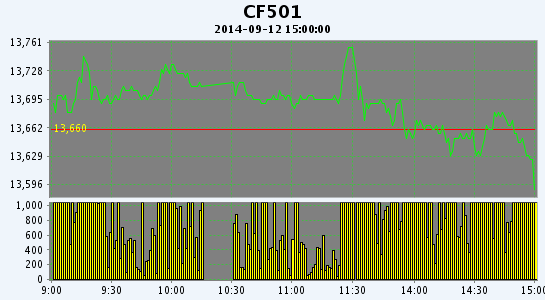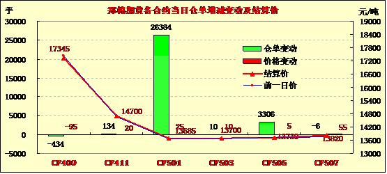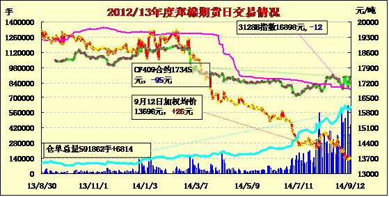 9月12日,鄭棉CF1501合約高開,早盤寬幅震蕩,午后在空頭賣盤打壓下走低,尾盤快速跳水,日線形成高開陰線,日內(nèi)成交量放大,持倉量增加?;久媲闆r:安徽省太湖縣一家400型棉花企業(yè)開秤收購籽棉,據(jù)了解,這是安慶市范圍內(nèi)最先收購籽棉的棉企。據(jù)這家棉企負(fù)責(zé)人介紹,10日全天一共收購了2000多斤籽棉,全部用現(xiàn)金結(jié)算。收購的籽棉質(zhì)量相當(dāng)于過去的4級棉,通過加工,皮棉能達(dá)上淡點污棉2級,籽棉的水分在13~14點范圍,收購價格在3.00~3.20元/斤區(qū)間。由于與去年相同籽棉質(zhì)量收購價在3.8元/斤左右相比每斤要低6毛多錢,因此棉農(nóng)交售積極性并不高,幾乎是試探性的,每戶交售的籽棉數(shù)量都不多,最大的量也就在100斤。