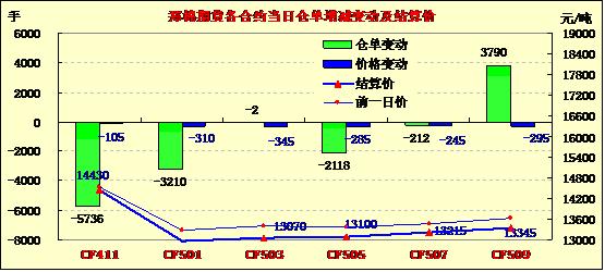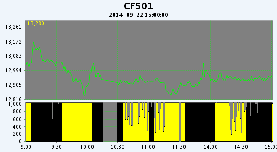 9月22日,鄭棉CF1501合約平開,早盤反彈后在空頭賣盤壓力下走低,隨后受回補買盤支撐反彈盤整,日線形成1/2下影線的陰線,日內(nèi)成交量溫和放大,持倉量減少?;久媲闆r:9月新疆棉區(qū)自北向南遭遇較大范圍內(nèi)降溫天氣,北疆新疆沿天山及以北地區(qū)降溫8-15度,部分棉區(qū)出現(xiàn)輕微霜凍;而東部以及中部降溫幅度達10-15度,南疆阿克蘇、庫爾勒、喀什三大主產(chǎn)棉區(qū)連續(xù)三日氣溫維持在12-22度,且多陰雨,棉花采摘、收購期進一步推遲,阿瓦提、柯坪、巴楚等地預(yù)計中期花、秋桃采摘要較往年落后25-30天。發(fā)改委今表示,明年除發(fā)放按照加入WTO承諾的89.4萬噸關(guān)稅進口配額、滿足紡織配棉等需要外,鼓勵用國產(chǎn)棉,不再增發(fā)棉花進口配額,棉花市場將繼續(xù)承壓。
