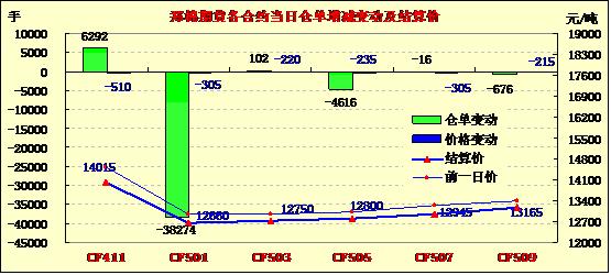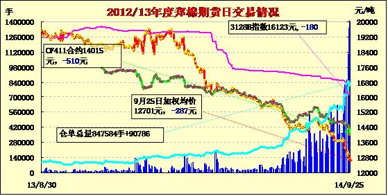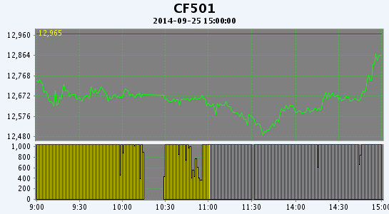 9月25日,鄭棉CF1501合約平開,早盤橫向盤整,午后下滑,隨后在空頭集中回補(bǔ)推動(dòng)下大幅回升,尾盤收于日高,日線形成長(zhǎng)下影線的陽(yáng)線,日內(nèi)成交量創(chuàng)新高,持倉(cāng)量大幅減少。
