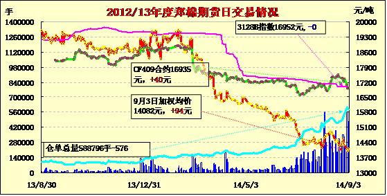 9月3日,鄭棉CF1501合約低開,早盤在多頭買盤推動下沖高,隨后高位震蕩,尾盤在多頭集中平倉盤壓制下迅速滑落,日線形成長上影線的陽線,日內(nèi)成交量放大,持倉量先增后減?;久媲闆r:當(dāng)前紡織市場銷售情況平平,多數(shù)紡織企業(yè)原料庫存較低,好一些的在20天左右的用量,差一些的維持生產(chǎn),庫存基本在一周左右,由于棉價(jià)平穩(wěn)下滑企業(yè)隨用隨買居多。當(dāng)前棉花期貨價(jià)格持續(xù)下跌,而新籽棉收購價(jià)格基本上居高不下。棉區(qū)新棉采摘之后,棉農(nóng)惜售情緒較濃后,不少棉花經(jīng)紀(jì)人在積極收購,價(jià)格基本在3元/斤以上,低于3元棉農(nóng)很難接受。據(jù)了解,當(dāng)前湖北地區(qū)農(nóng)民的各項(xiàng)農(nóng)作物如大豆、玉米等收益都不太好,而大型棉花企業(yè)均比較迷茫,觀望情緒比較濃厚。由于今年成本不太好控制,企業(yè)資金又沒到位,不敢貿(mào)然入市。