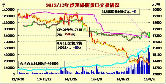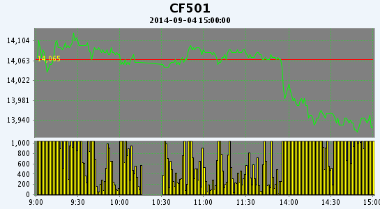 9月4日,鄭棉CF1501合約高開,早盤橫向震蕩,午后受空頭賣盤打壓下跌,日線形成陰線,日內(nèi)成交量萎縮,持倉量增加?;久媲闆r:9月1-2日阿克蘇棉區(qū)底桃僅零星吐絮,中期花坐桃率達到70%-80%,長勢較好品種單株棉桃達到12-13個,一些中早熟品種伏期桃已少量吐絮,一般一茬或兩茬采摘就可以結(jié)束,但很多中熟、晚熟品種蓋頂花開得非常好,中期桃子也相對較好,但由于近幾年南疆大多11月上旬下霜,農(nóng)民擔心大量的蓋頂桃無法吐絮甚至坐桃。近日阿克蘇大部棉區(qū)氣溫13-31度,晝夜溫差拉大,而且個別棉區(qū)陣雨增多,棉花品質(zhì)、長度或?qū)⑾陆?,農(nóng)民大面積采摘預(yù)計要推遲到9月20日-11月中旬,一些棉企表示,由于棉農(nóng)同軋花廠的心理預(yù)期相差近1元/公斤,因此開秤初期農(nóng)民不賣,軋花廠不敢收的僵持時間或比較長,不排除出現(xiàn)棉農(nóng)“賣棉難”的情況。