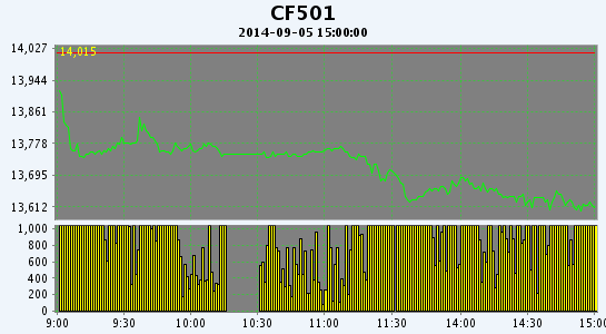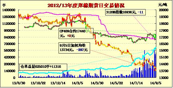 9月5日,鄭棉CF1501合約平開,早盤增倉下滑后橫向整理,午后受空頭賣盤與多頭止損盤打壓下跌,日線形成陰線,日內(nèi)成交量放大,持倉量增加?;久媲闆r:9月1-2日阿克蘇棉區(qū)底桃僅零星吐絮,中期花坐桃率達到70%-80%,長勢較好品種單株棉桃達到12-13個,一些中早熟品種伏期桃已少量吐絮,一般一茬或兩茬采摘就可以結(jié)束,但很多中熟、晚熟品種蓋頂花開得非常好,中期桃子也相對較好,但由于近幾年南疆大多11月上旬下霜,農(nóng)民擔(dān)心大量的蓋頂桃無法吐絮甚至坐桃。近日阿克蘇大部棉區(qū)氣溫13-31度,晝夜溫差拉大,而且個別棉區(qū)陣雨增多,棉花品質(zhì)、長度或?qū)⑾陆?,農(nóng)民大面積采摘預(yù)計要推遲到9月20日-11月中旬,一些棉企表示,由于棉農(nóng)同軋花廠的心理預(yù)期相差近1元/公斤,因此開秤初期農(nóng)民不賣,軋花廠不敢收的僵持時間或比較長,不排除出現(xiàn)棉農(nóng)“賣棉難”的情況。