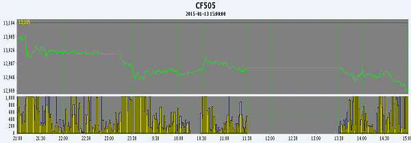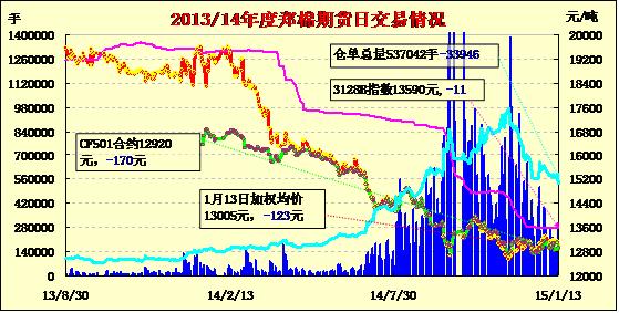 1月13日,隔夜鄭棉CF1505合約下滑,今日盤中在多頭平倉壓制下走低,日線形成陰線,日內(nèi)成交量放大,持倉量減少?;久媲闆r:從望江、宿松、太湖等棉花主產(chǎn)區(qū)獲悉,丘陵地區(qū)的棉農(nóng)在元旦前籽棉基交售完畢,而象望江、宿松圩區(qū)的棉農(nóng)10-11月因籽棉3128(衣分39.5,水分13%)價格從3.35元/斤一路下跌至現(xiàn)在的3.05元/斤一線,惜售情緒較濃厚,最多的農(nóng)戶家存有3萬多斤,一兩未賣。