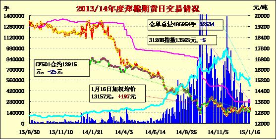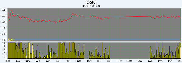 1月16日,隔夜鄭棉CF1505合約沖高,今日早盤在空頭回補支撐下維持橫向盤整,日線形成1/3上影線的陽線,日內(nèi)成交量放大,持倉量減少?;久媲闆r:目前南疆站臺中期二三級棉主流報價在13700-14000元/噸,后期二三級棉報價在13400-13600元/噸,而部分后期三級或摻雜淡點污棉一級的手采皮棉,軋花廠甩貨價在13000元/噸左右。北疆手采棉站臺主流報價與南疆持平,但由于收購結(jié)束期偏早,低成本的后期棉庫存大多已經(jīng)銷售完畢,因此過低的價格在北疆并不常見。機采棉報價平穩(wěn)為主,中期優(yōu)質(zhì)資源不足,下游采購謹慎,超過13000元/噸的價格鮮少出現(xiàn)。