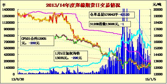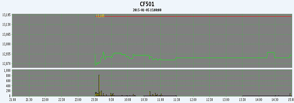 1月5日,鄭棉CF1505合約低開,早盤探低后在空頭集中回補推動下反抽,隨后橫向震蕩,日線形成陰線星,日內(nèi)成交量變化不大,持倉量減少。基本面情況:進入2015年,棉市并未給大家?guī)硇履晷職庀?,山東濱州地區(qū)軋花廠開工率有限,市場不溫不火運行。據(jù)悉,當(dāng)?shù)刈衙拶|(zhì)量均好于往年,軋花廠收購價格也居山東之首,部分廠價報價在3.15-3.20元/斤一線(衣分40-41%,水分10-11%)。因種植面積逐年下降,目前當(dāng)?shù)刈衙奚鲜辛恳堰^半。近日廠家收購量更顯不足,部分廠家三五天加工一次,且為了降低成本,僅在晚上(電費低)加工。節(jié)后,皮棉行情相對穩(wěn)定,三級皮棉送至魏橋價格13000元/噸(帶票,公定結(jié)算)一線,棉籽滯漲轉(zhuǎn)弱,出廠價在1.15元/斤(因質(zhì)量較好,價格高于魯西南地區(qū)),送至德州地區(qū)油廠價格在1.18-1.185元/斤一線,較節(jié)前回落0.005-0.01元/斤。