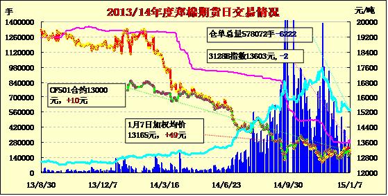 1月7日,隔夜鄭棉CF1505合約沖高,今日早盤在多頭平倉壓制下走低,日線形成2/3上影線的陰線,日內(nèi)成交量溫和放大,持倉量略有減少。基本面情況:今日南疆阿克蘇、喀什、巴州各地站臺中期二三級棉主流報價13700-14000元/噸,三級棉報價在13500-13700元/噸,價格基本平穩(wěn),成交維持少量。北疆優(yōu)質(zhì)手采棉庫存較多,而優(yōu)質(zhì)機(jī)采棉資源相對較少,剩余的部分混軋皮棉近期受關(guān)注度不佳。北疆手采棉主流報價在13600-14000元/噸,低價貨源稀少,而優(yōu)質(zhì)機(jī)采棉存在13200-13300元/噸的高價,后期機(jī)采棉多在13000元/噸以下,市場詢采一般。由于市場價格與成本仍處于倒掛狀態(tài),軋花廠對于優(yōu)質(zhì)皮棉惜售情緒仍然濃厚,并且多數(shù)庫存正陸續(xù)發(fā)運(yùn)內(nèi)地。而下游需求方面依舊清淡,盡管近期部分中小企業(yè)赴疆少量采購,但采購量普遍不大,且主要是低質(zhì)量的低價棉,不過小單成交也在一定程度上緩解了部分軋花廠的資金壓力。