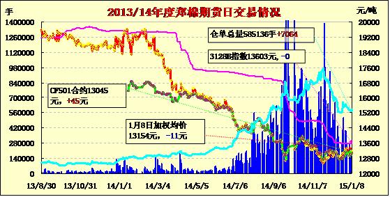 1月8日,隔夜鄭棉CF1505合約探低回升,今日早盤(pán)在多頭買(mǎi)盤(pán)支撐下橫向震蕩,日線(xiàn)形成小陽(yáng)線(xiàn),日內(nèi)成交量變化不大,持倉(cāng)量略有增加。據(jù)查驗(yàn),目前鹽城等地籽棉收購(gòu)市場(chǎng)級(jí)內(nèi)含水雜在12點(diǎn)以上,13-14點(diǎn)較為正常,對(duì)于低級(jí)棉,如此含水雜往往不預(yù)收購(gòu),但有些企業(yè)會(huì)收下作攤曬處理,當(dāng)然價(jià)格也會(huì)雙方協(xié)商。收購(gòu)技術(shù)人員認(rèn)為,對(duì)極端氣候下上市的棉花要堅(jiān)持批批試軋測(cè)評(píng),以防夾心棉傷級(jí)整體品質(zhì),而因?yàn)閿?shù)量少,若把含水較高的籽棉收進(jìn),待到成批后加工,含水偏高的籽棉長(zhǎng)期堆焐后會(huì)發(fā)生自燃,因而收購(gòu)檢驗(yàn)務(wù)必謹(jǐn)慎。另?yè)?jù)了解,蘇北鹽城棉區(qū)無(wú)論是企業(yè)收購(gòu)還是棉販私收,近期價(jià)格均呈跌勢(shì)。正三級(jí)籽棉價(jià)格不超過(guò)3元,一條龍統(tǒng)棉棉販報(bào)價(jià)2.50元以?xún)?nèi),而紡織企業(yè)反映的同樣是皮棉價(jià)位亦處小幅下行的消息。