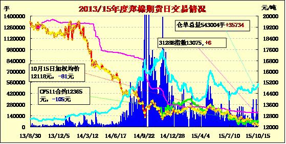 10月15日,隔夜鄭棉CF1601、1605合約沖高,今日早盤盤跌,尾盤在空頭賣盤打壓下迅速走低,日線形成陰線,日內(nèi)成交量變化不大,持倉量增加?;久媲闆r:據(jù)了解,因擔(dān)心籽棉纖維長度短、馬值大導(dǎo)致皮棉銷售困難,售價與皮棉成本“倒掛”較大,一些農(nóng)民、植棉單位將伏前花摻入中期花中交售,10月中旬以來疆內(nèi)一些棉花企業(yè)再次從嚴(yán)檢驗收購,對纖維長度低于27mm、馬值為C2的籽棉直接拒收,對沒有實現(xiàn)分等級、品質(zhì)差異較大的籽棉拒收,對長度達28mm及以上、馬值為A或B的籽棉給予0.03-0.05元/公斤加價。
