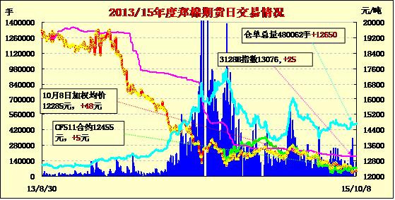 10月8日,今日CF1601、CF1605合約高開,盤中在空頭賣盤打壓下走低,日線形成高開陰線,日內(nèi)成交量變化不大,持倉(cāng)量增加?;久媲闆r:10.1-10.8日,南疆庫(kù)爾勒、阿克蘇、喀什三大棉區(qū)籽棉收購(gòu)市場(chǎng)仍表現(xiàn)得“波瀾不驚”,往年提價(jià)搶收的現(xiàn)象非常少見,各軋花廠“謹(jǐn)小慎微”。40衣份、13%以內(nèi)水份籽棉收購(gòu)價(jià)雖然仍穩(wěn)定在5.60-5.70元/公斤(巴楚縣及阿克蘇西大橋等地因軋花廠比較集中交售價(jià)5.70-5.80元/公斤),但由于棉籽收購(gòu)價(jià)格已下滑至1.60元/公斤左右(軋花廠擔(dān)心棉籽大量上市價(jià)格將跌破1.50元/公斤),皮棉疆內(nèi)站臺(tái)提貨價(jià)已與軋花廠皮棉綜合成本“倒掛”300-400元/噸(含財(cái)務(wù)成本),因此十一期間阿克蘇沙雅、庫(kù)車及巴楚等地部分軋花廠暫?;驎壕徥召?gòu),莎車、岳普湖、伽師等40衣份籽棉收購(gòu)價(jià)回調(diào)至5.40-5.50元/公斤,較9月底下滑0.10-0.15元/公斤。莎車某軋花廠表示,從幾家當(dāng)?shù)孛奁蟮钠っ薰珯z結(jié)果來看,纖維長(zhǎng)度普遍不理想(28mm及以下占比高),強(qiáng)力達(dá)到29CN及以上的比例不足50%,馬值C2占比大,因此銷售或遇到很大困難。