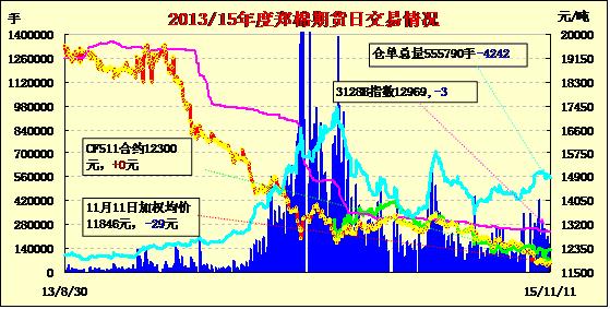 11月11日,隔夜鄭棉CF1601、1605合約探低回升,今日盤中橫向震蕩,日線形成小陰線,日內(nèi)遠(yuǎn)月成交量萎縮,持倉量減少?;久媲闆r:由于中期花交售量逐漸下滑,霜期花、黃染棉的上市量不斷增長,而40衣分、13%以內(nèi)水分的籽棉收購價仍“堅(jiān)守”在5.60-5.70元/公斤,巴楚、西大橋仍有少數(shù)軋花廠40衣分籽棉收購價在5.75-5.80元/公斤。南疆部分棉企一方面嚴(yán)控籽棉收購標(biāo)準(zhǔn),特別是纖維長度低于27mm拒收;另一方面抓緊加工、入庫公檢并移庫至內(nèi)地市場,11月20日前預(yù)計(jì)將有20%-30%的棉企止收購,11月底前全部加工結(jié)束。