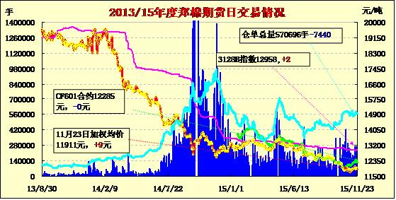 11月23日,隔夜鄭棉CF1601、1605合約震蕩,今日早盤下滑區(qū)間整理,CF1601合約日線形成陽(yáng)線星,CF1605合約形成小陰線,日內(nèi)遠(yuǎn)月成交量萎縮,持倉(cāng)量減少。基本面情況:11月21-22日,南疆阿瓦提、沙雅及巴楚、麥改提等地40衣分籽棉、13%以內(nèi)水分籽棉(3128級(jí))收購(gòu)價(jià)5.75-5.85元/公斤,42以上衣分籽棉收購(gòu)價(jià)在6元/公斤左右,因中期花供應(yīng)量大幅減少,秋桃、霜后花的占比上升,軋花廠逐漸恢復(fù)“統(tǒng)花”收購(gòu)模式,棉農(nóng)不分級(jí)、籽棉混摻及水分超標(biāo)的現(xiàn)象較重,棉企拒收現(xiàn)象增多。而且籽棉衣分普降至38-39,纖維長(zhǎng)度27mm及以下占比上升,棉企大幅下調(diào)籽棉收購(gòu)價(jià)引發(fā)棉農(nóng)和植棉單位不滿和惜售。據(jù)了解,目前南疆各站臺(tái)皮棉報(bào)價(jià)相對(duì)企穩(wěn),絮棉需求量低且報(bào)價(jià)低于紡棉200-300元/噸,棉企認(rèn)為3128級(jí)馬值C2(2128級(jí)馬值C2)做絮棉太可惜且虧損較大,仍傾向于運(yùn)至內(nèi)地市場(chǎng)銷售給棉紡織廠,23日阿克蘇地區(qū)站臺(tái)3128級(jí)馬值C2皮棉毛重提貨報(bào)價(jià)12600-12800元/噸。