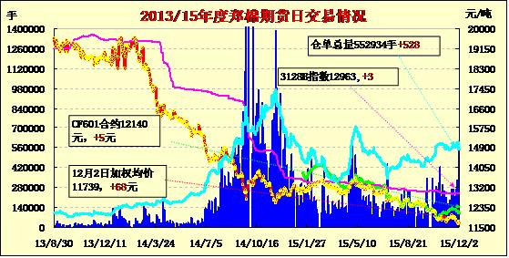 12月2日,隔夜鄭棉CF1601、1605合約上行后盤整,今日盤中延續(xù)窄幅震蕩走勢,日線形成小陽線,日內(nèi)成交量萎縮,持倉量近增遠減?;久媲闆r:11月底北疆某兵團棉麻公司報價如下(公定結(jié)算):機采棉3127B級、手摘棉3127B級分別為12000元/噸、12500元/噸;在山東河南、江蘇浙江機采棉3127B級報價分別為12400元/噸、12500元/噸。另外,“11、21”級升水200元/噸、100元/噸;28mm升水400元/噸,馬值C2貼水100元/噸,C1貼水400元/噸???、石河子、昌吉等地方棉企認為按此標準折算,3128B、2128B級機采棉疆內(nèi)站臺提貨價分別為12400元/噸、12500元/噸(公定),以回潮率5.5%-6.5%計算(本年度皮棉回潮較往年偏低),折合毛重提貨約12650-12770元/噸、12750-12875元/噸。3128B、2128B級手摘棉的疆內(nèi)站臺提貨價分別為13150-13300元/噸、13250-13400元/噸,高于當前地方棉企3128B級報價100-300元/噸,棉企短期疆內(nèi)外出貨的難度上升,內(nèi)地棉紡織企業(yè)、棉花經(jīng)營商的選擇空間擴大。