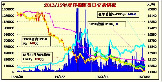 12月21日,隔夜鄭棉1605合約盤整,今日在空頭回補(bǔ)推動(dòng)下沖高,此后盤升收強(qiáng),日線形成陽線,日內(nèi)成交量放大,持倉量減少?;久媲闆r:近期因多種因素影響,桐城、樅陽等縣有4家棉企停止了籽棉收購。這些因素大致為:一是當(dāng)?shù)厥辉?、十二月天氣是雨天多晴天少,不利籽棉收購;二是十一月份大部分時(shí)間陰雨形成雨銹棉,現(xiàn)在雨銹棉和尾花開始上市,籽棉質(zhì)量下降,籽棉含水偏高,衣份降低;三是皮棉現(xiàn)貨銷售越來越低迷,走貨慢價(jià)格逐步下跌。3128大包皮棉目前銷價(jià)在12500~12700元/噸,小包棉在12300~12500元/噸,較本月上旬每噸又下跌了100元左右。皮棉銷售價(jià)格跌但籽棉收購價(jià)還保持穩(wěn)中有漲態(tài)勢,棉企毛利漸漸被壓縮,大廠已處于保本狀態(tài)。不少棉企擔(dān)心皮棉壓庫會(huì)形成虧損,只好選擇停收。
