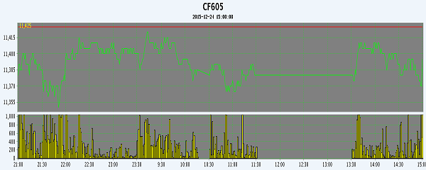 12月24日,隔夜鄭棉1605合約探底回升,今日盤中橫盤震蕩,日線形成陽線,日內(nèi)成交量萎縮,持倉量增加。