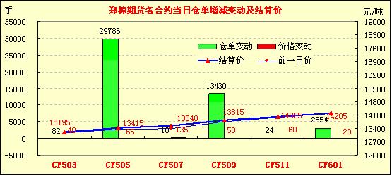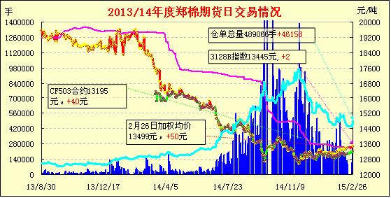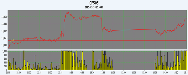 2月26日,隔夜鄭棉CF1505合約平開震蕩,今日早盤在多頭買盤推動(dòng)下走高,隨后在少量平倉(cāng)盤壓制下調(diào)整午后空頭回補(bǔ)與多頭買盤推動(dòng)期價(jià)回升,日線形成陽(yáng)線,日內(nèi)成交量放大,持倉(cāng)量增加。基本面情況:據(jù)了解,河北紡織企業(yè)均等待正月初十過(guò)后恢復(fù)生產(chǎn)工作,棉花企業(yè)則較晚一些,多數(shù)準(zhǔn)備過(guò)了元宵節(jié)再進(jìn)行籽棉收購(gòu)?,F(xiàn)貨市場(chǎng)地產(chǎn)3218級(jí)皮棉銷售報(bào)價(jià)為13000-13100元/噸(毛重帶票自提價(jià)格),4128級(jí)銷售報(bào)價(jià)為12500-12600元/噸。內(nèi)地倉(cāng)庫(kù)疆棉2128級(jí)皮棉銷售報(bào)價(jià)為14400-14500元/噸,3128級(jí)皮棉銷售報(bào)價(jià)為14000-14100元/噸。