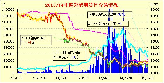 3月11日,隔夜鄭棉CF1505合約橫向震蕩,今日早盤在平倉(cāng)盤打壓下回落,隨后空頭回補(bǔ)推動(dòng)期價(jià)反彈,午后窄幅整理,日線形成2/3下影線的小陰線,日內(nèi)成交量萎縮,持倉(cāng)量繼續(xù)減少。基本面情況:目前南疆阿克蘇、庫(kù)爾勒以及巴楚等各棉區(qū)農(nóng)民開始澆灌“春水”,預(yù)計(jì)3月25日前后結(jié)束,而化肥、地膜、種子、農(nóng)藥等農(nóng)資的采購(gòu)卻沒(méi)有全面展開,僅一些種植大戶、漢族棉農(nóng)詢價(jià)購(gòu)買;一方面是目前信用社貸款申請(qǐng)尚沒(méi)有開始,農(nóng)民資金普遍不寬裕,按產(chǎn)量直補(bǔ)款還沒(méi)有落實(shí)到位;另一方面一年一承包的縣鎮(zhèn)鄉(xiāng)棉花地尚未競(jìng)標(biāo),除了自留地外,農(nóng)民能種多少畝地棉花沒(méi)法確定;而且對(duì)于2014年植棉收益,農(nóng)民普遍不滿意,試圖種植結(jié)構(gòu)調(diào)整,但種什么、種多少畝都沒(méi)有明確說(shuō)法,一些農(nóng)民認(rèn)為近兩年辣椒、中藥等收益較好,有轉(zhuǎn)向的計(jì)劃。