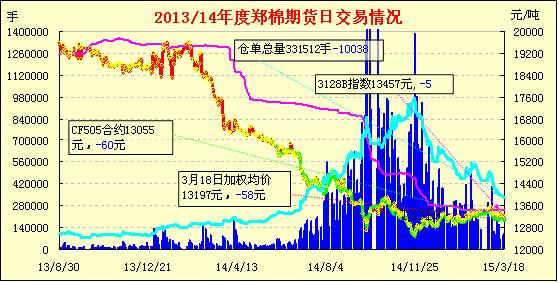 3月18日,隔夜鄭棉CF1505合約盤整,今日早盤CF1505合約在多頭平倉盤壓制下走低,日線形成小陰線,日內(nèi)成交量變化不大,持倉量繼續(xù)減少。CF1509合約夜盤窄幅震蕩,今日早盤橫向整理,尾盤一度跳水,隨后在逢低買盤支撐下反彈,日線形成1/2下影線的陰線,日內(nèi)成交量放大,持倉量增加?;久媲闆r:從3月16日開始安徽池州又迎來一場降雨,據(jù)天氣預(yù)報講未來3天,當(dāng)?shù)囟家杂晁鞖鉃橹?,并伴有雷暴、短時強(qiáng)降水等對流天氣。不過氣溫變化不大,最高氣溫保持在16攝氏度左右,最低氣溫保持在11攝氏度左右。籽棉收購工作全面停止。