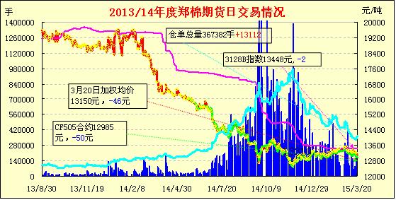 3月20日,隔夜鄭棉CF1505合約小幅反彈,今日早盤橫平倉盤壓制下走低,午后小幅的彈,日線形成小陰線,日內(nèi)成交量萎縮,持倉量繼續(xù)減少。CF1509合約夜盤整,今日早盤橫盤,午后在空頭賣盤壓制下走低,尾盤在周末回補支撐下反彈,日線形成長小陰線,日內(nèi)成交量萎縮,持倉量增加。基本面情況:目前隨著市場籽棉的逐漸減少,池州棉花企業(yè)的日收購量只有2-3萬斤,根據(jù)紡織廠的需求,只收質(zhì)量好的籽棉,當(dāng)?shù)氐淖衙奘召弮r格基本保持在3.08元/斤左右,不過衣分要求40%以上,雜質(zhì)在13%以內(nèi),水分12%以內(nèi)。低級籽棉暫未收購,考慮到加工成本,即變壓器損耗以及用工成本等因素,企業(yè)均候再收些籽棉量一并加工,加工結(jié)束就不再收購了。