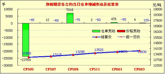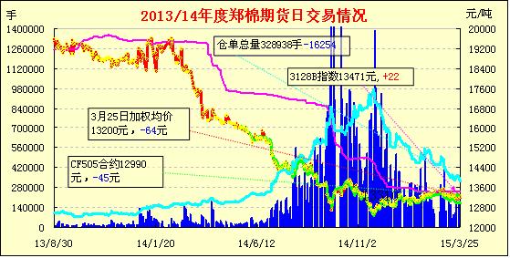 3月25日,隔夜鄭棉CF1505合約區(qū)間震蕩,今日早盤反彈后在平倉盤壓制下走低,尾盤收于日線點附近,日線形成小陰線,日內(nèi)成交量萎縮,持倉量大幅減少。CF1509合約夜盤橫向震蕩,今日午前在空頭賣盤打壓下走低,午后重心下移,終盤收于日低一線,日線形成陰線,日內(nèi)成交量萎縮,持倉量增加。基本面情況:3月23-24日內(nèi)地山東、河南、河北、江浙等地南疆3128、2128(2129)級手采棉的毛重報價集中在13800-14000元/噸、14100-14200元/噸,個別精揀“三絲”、加工質(zhì)量較好的二級棉報價約14300元/噸左右,較3月中旬反彈50-100元/噸。但3128級機(jī)采棉內(nèi)地倉庫報價仍在12800-13200元/噸,棉企、貿(mào)易商短期也有上調(diào)報價的意愿。據(jù)傳言,山東某大型紡織企業(yè)一次簽約采購了5萬噸兵團(tuán)機(jī)采棉。