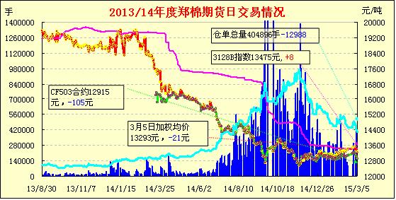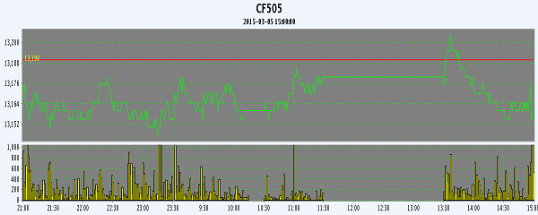 3月5日,隔夜鄭棉CF1505合約窄幅震蕩,今日早盤在空頭回補推動下反彈,隨后在多頭平倉盤壓制下回落,日線形成小陰線,日內成交量變化不大,持倉量減少。基本面情況:據(jù)射陽縣的一份調查顯示,2月份該縣棉企累計銷售地產棉只有210噸,僅占1月份實際銷售量的44.7%,且以節(jié)前銷售為主。銷售價格環(huán)比基本持平,3129A級平均每噸13850元,1228B級在13300元左右。折合標準級13550元,環(huán)比降20元,降幅僅為0.15%;同比跌5150元,跌幅27.54%,比1月份分別縮小了2.01個和1.78個百分點。節(jié)后,縣內有部分紡織企業(yè)雖然已經陸續(xù)恢復生產,但用棉均以節(jié)前儲備為主,暫時還沒有顧及補庫。偶有外地企業(yè)約談賒欠,雖然報價高于現(xiàn)貨市場價格,但無一成交。大豐市多家棉企調查,存貨有多有少,主要取決于資金實力和上年秋冬收購加工量。由于部分資源采購于外地,成本較大,企業(yè)也無力承擔壓庫待價壓力,且組織的資金多為短期貸款,所以多數(shù)即加工即銷售了?,F(xiàn)存貨源不多,面臨的價格上行的時間及幅度也企業(yè)不太了然,所以,期望適期銷售的企業(yè)較多。