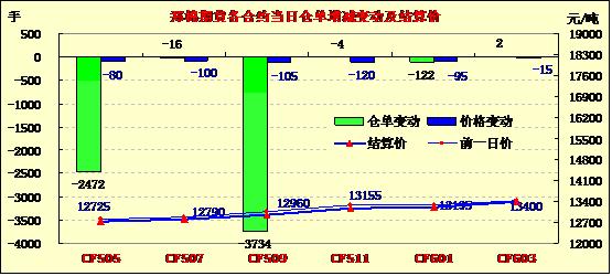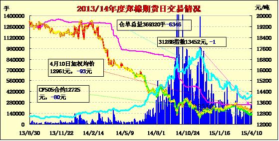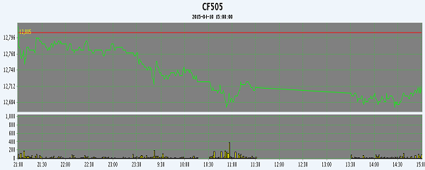 4月10日,隔夜鄭棉CF1509合約盤整,今日早盤在多頭平倉壓制下走低,隨后在空頭回補(bǔ)推動(dòng)下反彈,午后窄幅震蕩,日線形成陰線,日內(nèi)成交量萎縮,持倉量減少?;久媲闆r:昌吉地區(qū)皮棉總體銷售基本過半,庫存占總加工量的44%左右。棉企具體銷售情況各異,銷售進(jìn)度好的已經(jīng)售罄,進(jìn)度慢的目前庫存壓力相對(duì)較大。庫存量大的棉企負(fù)責(zé)人表示目前看貨詢價(jià)的商家較多,但價(jià)格過低,影響成交。