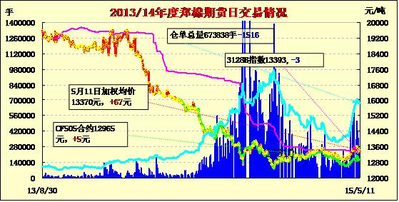 5月11日,隔夜鄭棉CF1509合約調(diào)整,今日回升震蕩,日線形成低開陽線,日內(nèi)成交量萎縮,持倉量減少?;久媲闆r:據(jù)阿克蘇一棉企反饋,2014年棉花加工量在7700噸左右,其中細(xì)絨棉4700噸,現(xiàn)已基本銷售告罄,該棉企說,他們預(yù)測(cè)到本年度的細(xì)絨棉市場(chǎng)行情不好,所以前期抓緊銷售細(xì)絨棉,以免后期滯銷,銷售價(jià)格在13500元/噸左右。該棉企長(zhǎng)絨棉加工量在3000噸左右,銷售價(jià)格在28000元/噸左右,目前銷售進(jìn)度緩慢。他們反映,現(xiàn)在的用棉企業(yè)都是隨用隨買,不再像以前一下購買2、3個(gè)月的量,有部分棉企到了還農(nóng)發(fā)行貸款的日期,銷售壓力倍增,但目前只有少量詢價(jià)企業(yè),且多以單批和雙批成交為主,成交不活躍是當(dāng)前市場(chǎng)的主要體現(xiàn),對(duì)于當(dāng)前市場(chǎng)棉企依舊看淡。