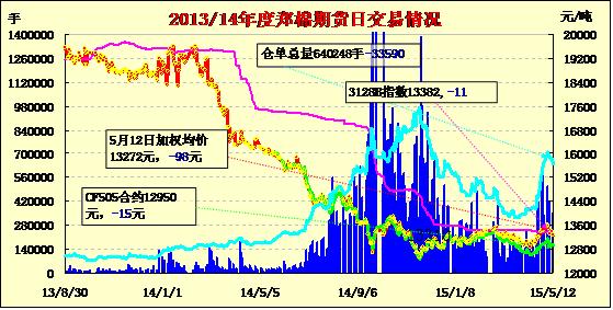 5月12日,隔夜鄭棉CF1509合約沖高回落,今日早盤(pán)窄幅震蕩,尾盤(pán)收低,日線形成低開(kāi)陰線,日內(nèi)成交量放大,持倉(cāng)量減少?;久媲闆r:據(jù)自治區(qū)氣象臺(tái)預(yù)報(bào),12日夜間,伊犁河谷、北疆沿天山一帶、天山山區(qū)和塔城、阿勒泰、南疆西部山區(qū)等地的部分地區(qū)有小雨,局部有大到暴雨;13~14日,伊犁河谷、南疆西部、阿克蘇等地的部分地區(qū)有小雨,局部有中到大雨,伴有4~5級(jí)西北風(fēng),南疆東部有4~5級(jí)偏東風(fēng),南疆盆地的部分地區(qū)伴有揚(yáng)沙或浮塵;18日前后,北疆大部、天山山區(qū)、南疆西部山區(qū)有微到小雨,局部有中到大雨。5月中旬降水量伊犁河谷、北疆沿天山一帶、天山山區(qū)略偏多,全疆其它地區(qū)略偏少。預(yù)計(jì)5月中旬氣象條件較有利于伊犁河谷棉區(qū)棉花立枯病的發(fā)生,全疆其余棉區(qū)棉花立枯病大面積發(fā)生的可能性較小,建議各棉區(qū)雨后及時(shí)中耕松土,北疆棉區(qū)對(duì)已出苗棉田做好查苗、放苗工作。