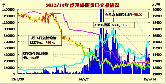 5月14日,周三ICE棉花期貨回升,隔夜鄭棉CF1509合約沖高后調(diào)整,今日早盤在空頭回補與多頭買盤推動下走高,日線形成小陽線,日內(nèi)成交量放大,持倉量略有減少。鄭棉CF1601合約早盤在多頭買盤推動下走高,日線形成陽線,日內(nèi)成交量放大,持倉量增加。 基本面情況:進入5月中旬,河北80%以上的軋花廠已沒有庫存,仍有庫存的企業(yè)要么棉花質(zhì)量存在問題,要么不甘心虧損銷售,正在躊躇徘徊之中。導(dǎo)致軋花廠急售心理的原因,除還貸壓力之外,近日,拋儲傳言不斷升溫。截至5月中旬,在河北省的棉花圈內(nèi)已是傳言滿天飛,雖至今仍無官方消息,但已引起棉花主體的警覺。當(dāng)日,一位棉商說,目前新疆棉、已通關(guān)外棉均有下調(diào)價格動作。他們公司的新疆手摘棉2128級價格14200元/噸,較昨日持平,3128級卻降至13700元/噸,較昨日降100元/噸;機采棉全面下調(diào)50-100元/噸,主流出庫價格13050元/噸。
