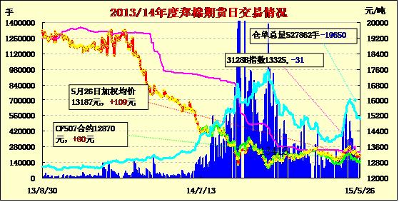 5月26日,隔夜鄭棉CF1509合約沖高,今日早盤(pán)區(qū)間震蕩,尾盤(pán)下滑,日線(xiàn)形長(zhǎng)上影線(xiàn)的陽(yáng)線(xiàn),日內(nèi)成交量放大,持倉(cāng)量減少。隔夜鄭棉CF1601合約震蕩上行,今日區(qū)間震蕩,尾盤(pán)下滑,日線(xiàn)形成1/2上影線(xiàn)的陽(yáng)線(xiàn),日內(nèi)成交量放大,持倉(cāng)量減少。基本面情況:5月24、25日南疆2128(2129)、3128(3129)級(jí)監(jiān)管庫(kù)毛重提貨13400-13500/噸、13000-13300元/噸,長(zhǎng)度28mm與29mm相差50-100元/噸,受鄭期CF1509跌破13000元/噸的影響,現(xiàn)貨報(bào)價(jià)也有50-100元/噸的回調(diào),買(mǎi)賣(mài)雙方的心理差價(jià)在200-300元/噸。阿克蘇一些加工企業(yè)表示,因監(jiān)管庫(kù)皮棉被買(mǎi)家多次挑選,“雙29”和高馬值、低雜質(zhì)的皮棉所剩無(wú)幾,采購(gòu)商對(duì)皮棉指標(biāo)的要求也相應(yīng)下滑。
