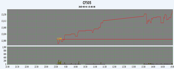 5月4日,鄭棉CF1509合約小幅低開,盤中在多頭買盤推動下走高,日線形成長陽線,日內(nèi)成交量溫和放大,持倉量增加?;久媲闆r:目前,北疆的烏蘇、沙灣、烏蘭烏蘇、瑪納斯及南疆吐鄯托盆地、輪臺、尉犁、阿克蘇地區(qū)大部與南疆西部大部棉區(qū)棉花已出苗,出苗期大部棉區(qū)較常年提早1~12天。部分已出苗的棉田已經(jīng)開始化調(diào)及病蟲害防治工作。據(jù)自治區(qū)氣象臺預(yù)報(bào),4~7日,伊犁河谷南部山區(qū)、天山山區(qū)等地的部分地區(qū)和烏魯木齊以東的北疆沿天山一帶、哈密北部等地的局部地區(qū)有微到小雨,山區(qū)的局部可達(dá)中到大量,氣溫有些下降。5月上旬旬平均氣溫北疆略偏高,南疆偏高;旬降水量南疆偏少,北疆略偏少。