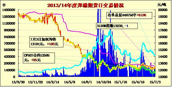 7月3日,隔夜鄭棉盤升,盤中增倉調(diào)整,日線形成1/2上影線的陽線,日內(nèi)成交量放大,持倉量增加。基本面情況:據(jù)南疆阿克蘇、庫爾勒等地的棉花企業(yè)反映,因猜測7月10日前后或?qū)?zhí)行100萬噸“輪儲”,再加上C40S及以上高支紗、精梳紗訂單呈現(xiàn)疲軟回落的趨勢,內(nèi)地棉紡織企業(yè)、經(jīng)營商對高等級南疆手采棉的詢價、提貨明顯減緩,有的紡企前期簽訂的采購合同也暫緩執(zhí)行,有的則簽了10批棉花,只提1-2批滿足近一周生產(chǎn)。7月1、2日疆內(nèi)皮棉的詢價、成交幾乎陷于停滯狀態(tài)。