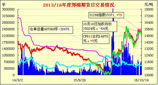 10月19日,隔夜鄭棉CF1701合約沖高后橫向震蕩,今日早盤下滑盤整,午后在多頭集中平倉盤打壓下迅速下滑,隨后低位震蕩,日線形成小陰線。日內(nèi)成交量放大,持倉量減少?;久媲闆r:現(xiàn)貨市場方面,皮棉報價走低。據(jù)南疆軋花廠企業(yè)反應(yīng),內(nèi)地紡織廠和貿(mào)易商3129B級皮棉接受價在15600-15800元/噸(毛重),2129B級皮棉接受價在15800-16000元/噸(毛重),價格較上周降低了300-500元/噸。據(jù)巴楚某軋花企業(yè)反應(yīng),隨著籽棉收購價的降低,內(nèi)地紡織廠,貿(mào)易商對皮棉的接受價降低,留給軋花廠企業(yè)的利潤空間減少。由于前期籽棉收購價格較高(40%衣分,13%水分,7.7元/公斤),皮棉成本“水漲船高”。在籽棉未降價前,3129B級皮棉報價在16300元/噸,有零星成交,目前這個價位無成交記錄。