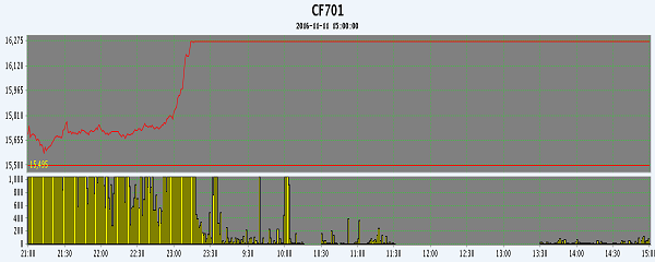 11月11日,隔夜鄭棉CF1701合約盤整后在多頭集中買盤推動(dòng)下沖擊漲停,今日牢牢封于漲停價(jià)位,日線形成長(zhǎng)陽(yáng)線。日內(nèi)成交量萎縮,持倉(cāng)量增加?;久媲闆r:現(xiàn)貨市場(chǎng)調(diào)整占據(jù)主導(dǎo),北疆機(jī)采棉現(xiàn)貨報(bào)價(jià)在15200-15500元/噸水平,地產(chǎn)棉3128級(jí)銷售在15200-15500元/噸,內(nèi)地庫(kù)疆棉價(jià)格在15800元/噸以上水平。而隨著近期期貨價(jià)格略回升,商家多積極期貨套保操作,新疆企業(yè)套保價(jià)格一般在15300-15550元/噸水平。