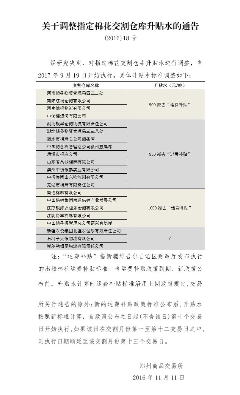 關(guān)于調(diào)整指定棉花交割倉庫升貼水的通告