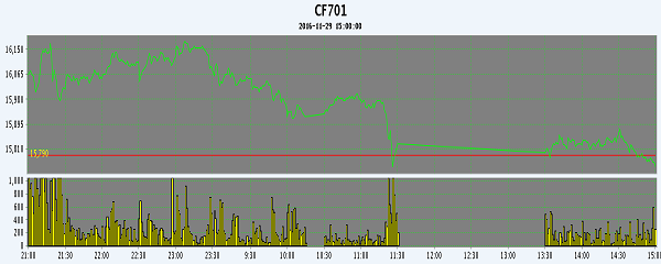 11月29日,隔夜鄭棉CF1701合約沖高,今日在平倉盤壓制下走低,日線形成陰線。日內(nèi)成交量放大,持倉量減少。 相關(guān)市場情況:周一ICE棉花期貨上漲?;久媲闆r:現(xiàn)貨報(bào)價增多價格松動,南疆監(jiān)管庫高價報(bào)價減少,3128級報(bào)價多在15500-15800元/噸毛重,商家出貨意向增濃,北疆雙29、雙30機(jī)采棉提貨報(bào)價也微降至15500-15800元/噸。而長絨棉市場相對維持穩(wěn)定,137級阿克蘇站臺提貨價20800元/噸毛重,237級在20000元/噸水平,實(shí)際成交有50-100元/噸優(yōu)惠。