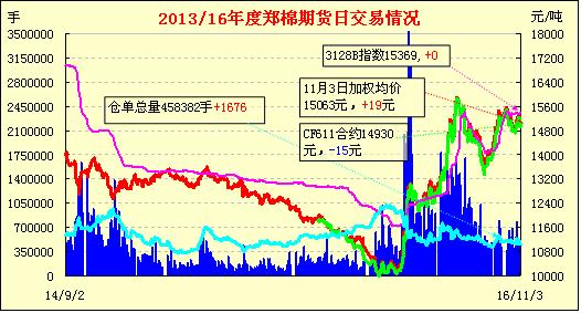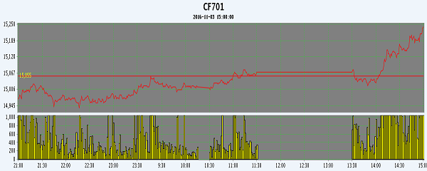 11月3日,隔夜鄭棉CF1701合約下探,今日早盤空頭回補推動下走高,午后多頭買盤繼續(xù)推高期價,日線形成陽線。日內(nèi)成交量萎縮,持倉量減少?;久媲闆r:據(jù)南疆地區(qū)軋花廠企業(yè)反應,11月2日籽棉收購價在7.1-7.3元/公斤,棉籽價格在2.5元/公斤。目前南疆地區(qū)棉花大部分為中期花,長度,馬值,斷裂比強度等綜合指標較好,軋花廠企業(yè)收購價格有略微上調(diào)。部分“霜后花”“剝桃棉”由于品質(zhì)較差,軋花廠企業(yè)提供的價格會稍微低0.1-0.3元/公斤。自11月份以來,內(nèi)地紡織廠和貿(mào)易商詢價的增多,皮棉成交略增。據(jù)庫爾勒地區(qū)一家倉儲企業(yè)反應,近幾日,皮棉站臺提貨的企業(yè)增加。上周平均每日出貨量為2-4車(平均每車為30-32噸,汽運),目前皮棉出庫量為6-8車。庫爾勒一家軋花廠企業(yè)反應,最近紡企和貿(mào)易商詢價的增多,3128B皮棉成交價格在15400元/噸(毛重,站臺自提)。“大部分紡企國儲棉備貨到12月份,紡企庫存一般維持在1月左右,現(xiàn)在到了采購16年度新疆棉花的時候了”輪臺縣一家軋花廠企業(yè)反應。