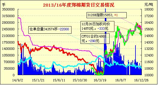 12月26日,隔夜鄭棉CF1705合約盤整,今日早盤在多頭平倉打壓下迅速下滑,盤中低點在空頭短線回補支撐下反彈,午后窄幅震蕩,日線形成陰線。日內(nèi)成交量萎縮,持倉量減少?;久媲闆r:據(jù)各紡企信息反饋,近期市場買賣雙方對后市看漲看跌的都有。因此棉價小幅上下波動。川內(nèi)市場目前疆棉現(xiàn)貨價格在1.65-1.66萬元/噸之間小幅波動,較新疆當?shù)睾蜄|部產(chǎn)棉區(qū)都高1千元以上。企業(yè)赴新疆自行采購的也十分謹慎。一是春運到來,下單時就必須解決好運輸問題;二是1、2月份假期較長,3月份就輪儲了,國內(nèi)大棉商手中還有國儲棉,目前紡企大量采購的風(fēng)險較大;三是紡織品市場進入淡季,需求不足,紡企被迫壓縮產(chǎn)能。因此,棉價雖高,但銷勢已經(jīng)減緩。