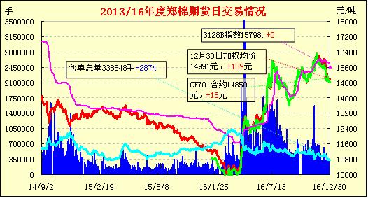 12月30日,隔夜鄭棉CF1705合約下試后在多頭買盤推動下回升,今日盤中高位震蕩,盤中大量換手,日線形成長下影線的陽線星。日內(nèi)成交量溫和放大,持倉量變化不大。基本面情況:現(xiàn)貨方面,軋花廠銷售壓力較大。第一,北疆地區(qū)細(xì)絨棉(白棉,手摘棉)平均收購價格比去年同期高1.5-2元/公斤左右,彩棉收購價格隨之上漲。據(jù)北疆地區(qū)一家軋花廠反映,今年彩棉收購成本高,皮棉報價在18000元/噸左右(公定,站臺自提)。