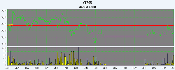 2月29日,隔夜鄭棉橫向震蕩,今日早盤CF1605合約下滑,隨后弱市震蕩,日線形成星線;CF1609合約早盤受多頭平倉打壓下滑,此后低位震蕩,日線形成小陰線。CF609和CF611、CF701收盤破萬元,分別為9990元和9940元。日內(nèi)成交量放大,持倉量近減遠(yuǎn)增,CF701大幅增倉22160手。