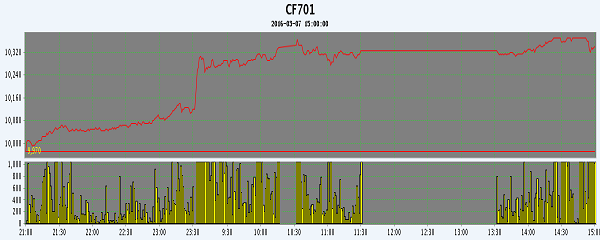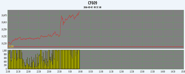 3月7日,隔夜鄭棉穩(wěn)中有漲,今日早盤CF1605合約在空頭回補推動下沖高,隨后下滑震蕩,日線形成長上影線的陽線;CF1609合約早盤在多頭買盤推動下走高,隨后震蕩上行,日線形成長陽線。日內(nèi)成交量放大,持倉量近減遠增?;久媲闆r:山東博興地區(qū)軋花廠斷續(xù)開工,目前有四五家軋花廠少量開機,一般持續(xù)收購幾天,集中開機。因籽棉質(zhì)量不同程度下降,加之經(jīng)營贏利困難,籽棉收購價格跌至2.50元/斤一線(衣分40%,水分10-12%),所加工皮棉多為四級,出廠價跌破萬元大關(guān),多數(shù)廠家以9800元/噸出售,市場成交平平。