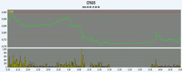 3月8日,隔夜鄭棉沖高調(diào)整,今日早盤CF1605合約在多頭平倉打壓下回落,隨后低位震蕩,日線形成陰線;CF1609合約早盤在多頭平倉打壓下走低,盤中低位減倉,隨后多頭買與空頭回補(bǔ)推動期價(jià)回升,日線形成長下影線的陰線。日內(nèi)成交量萎縮,持倉量減少。基本面情況:近日鄭棉期貨價(jià)格上漲,然而河北省棉花主產(chǎn)區(qū)之一的衡水市現(xiàn)貨市場沒有跟進(jìn),棉企、棉商繼續(xù)看空后市的觀念沒有絲毫改變。從3月1日開始,鄭棉期貨各月份合約價(jià)格止跌反彈,其中近月合約CF1603、1605、1607最高漲至11000、11180、10590點(diǎn),最大漲幅均接近或超過600點(diǎn);主力合約CF1609最高漲至10610點(diǎn),最大漲幅720點(diǎn);遠(yuǎn)月合約CF1611、1701最高漲至10560、10370點(diǎn),最大漲幅分別為675和725點(diǎn)。期貨價(jià)格上漲雖不能說一舉收復(fù)前期失地,但至少讓棉企、棉商眼前一亮,恐慌心理暫時(shí)得以松弛。不過當(dāng)?shù)孛奁?、棉商并未借機(jī)調(diào)高現(xiàn)貨銷售報(bào)價(jià),仍寄希望于以前期報(bào)價(jià)盡量壓低庫存。