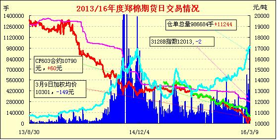 3月9日,隔夜鄭棉下跌,今日CF1605合約盤中橫向震蕩,日線形成小陽線;CF1609合約早盤在多頭買盤推動下上漲,隨后受到空頭賣盤與多頭平倉壓制下盤整,日線形成小陰線。日內(nèi)成交量萎縮,持倉量近減遠(yuǎn)增?;久媲闆r:業(yè)內(nèi)人士認(rèn)為,而棉價在近期乃至今后的走向,很大程度上取決于2016的首輪儲備棉輪出的情況,以及國家對棉花的配額、稅賦、補貼等等方面的宏觀調(diào)整安排。通過競拍落地后的棉價對于企業(yè)而言,至少是雙方都可以接受,其價位的合理性也將體現(xiàn)供需市場的基本狀態(tài),因而預(yù)計在新年輪出未正式啟動前,棉花市面觀望及期待輪出的氣氛仍將持續(xù)。