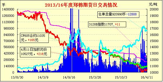 4月11日,隔夜鄭棉盤整,今日早盤在多頭買盤推動下迅速上行并封于漲停,日線形成長陽線。日內(nèi)成交量放大,近月合約持倉增加,遠月大量減倉?;久媲闆r:受棉紡織廠和貿(mào)易商詢價、要貨積極性明顯高漲的影響,疆內(nèi)棉花加工企業(yè)及中間商惜售、觀望情緒再次大范圍蔓延,阿克蘇、巴楚等地軋花廠高等級高品質(zhì)手采棉暫緩報價,或提高報價200-300元/噸,河北、山東等內(nèi)地庫2128C2(2129C2)、2128B2(2129B2)級的皮棉公檢毛重提貨價上調(diào)至12000-12200元/噸、12300-12500元/噸,而2128C2、3128C2(馬值5.0以上,斷裂比強度27-28CN)等中低品質(zhì)的棉花成交也較2、3月份活躍很多。河南、江蘇等地一些紡企反映,雖然近期有一些2129A/B級的南疆手采棉上市銷售,但多為中后期花,斷裂比強度僅27CN-28CN甚至26CN-27CN,只能用于氣流紡紗或低支環(huán)錠紡紗,“高品級低品質(zhì)”的情況比較突出。