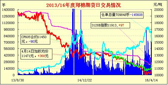 4月14日,隔夜鄭棉高開后調整,今日增量拉升,尾盤在多頭平倉的壓制下調整,CF1609合約日線形成陽線星,CF1701合約收陽線。日內成交量成倍增加,持倉減少?;久媲闆r:自4月1日以來,短短8個交易日CF1609合約暴漲1600元/噸以上,國內棉花現貨雖然跟進步伐比較緩慢,但新疆棉2128B、2129B、3128B等級的手采棉仍普漲了500-600元/噸。目前,貿易商和棉花加工企業(yè)報價比較少,買家詢價得也不多,一方面是電子盤大幅上漲,推動棉企報漲的意愿快速提升,大多參考期貨交割價格對外報價,買方大多無法接受,鄭期暴漲,棉花市場成交量卻小幅下滑;另一方面是下游棉紡織廠、面料、服裝、外貿企業(yè)資金狀況仍非常緊張,賒欠、帳期、承兌支付等很普遍,在電子盤價格不斷上漲的情況下,棉企更愿意選擇交割,能夠早日足額收回貨款。